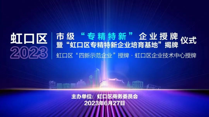 经虹口区商务委初审、专家评审、综合评估和网上公示,我公司被认定为“虹口区四新示范企业”。2023年6月27日在虹口区瑞虹企业天地,陈帅副区长向我公司进行了授牌。